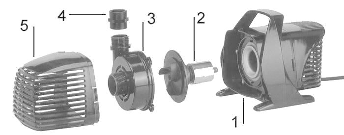 Устройство: 1. корпус насоса 2. ротор в сборе 3. держатель ротора 4. штуцер 5. крышка
